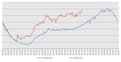 Network engineer Edward Henry posted his own graph showing peering traffic nearing 30 Gbps, about twice usual levels.