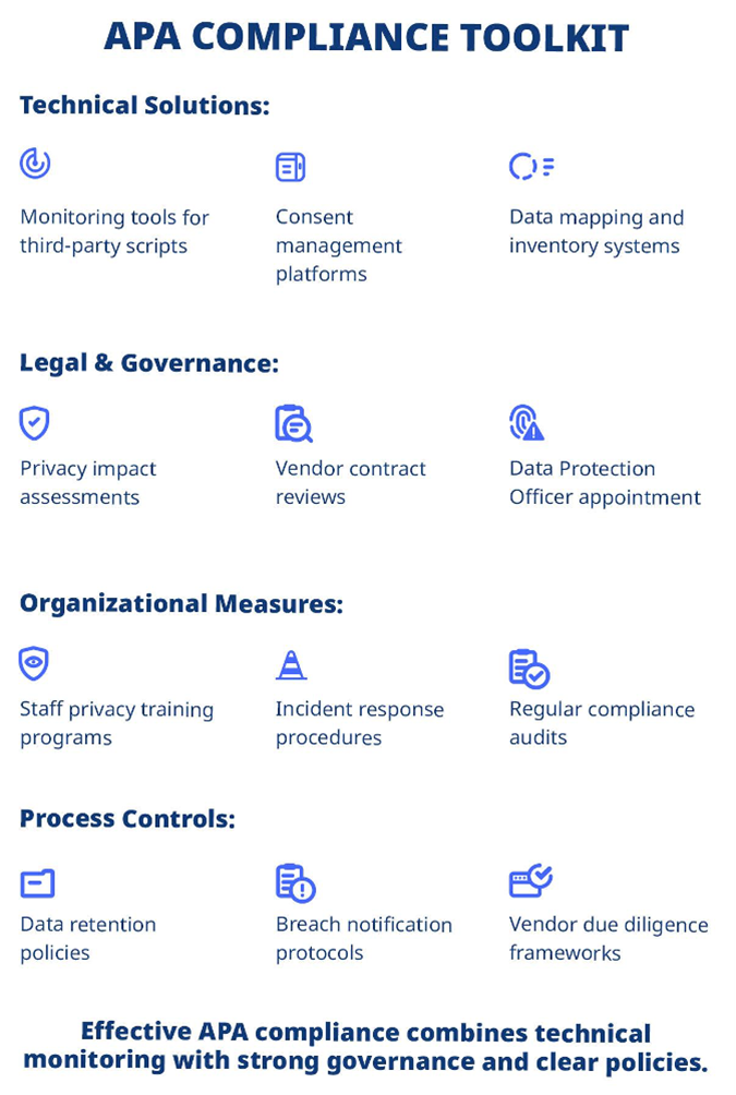 [The white paper] finds that the quickest and most effective route to APA compliance in this case is deploying a tool that constantly updates a map of all third-party scripts, pixels and cookies, monitors them for suspicious changes and alerts the user accordingly.