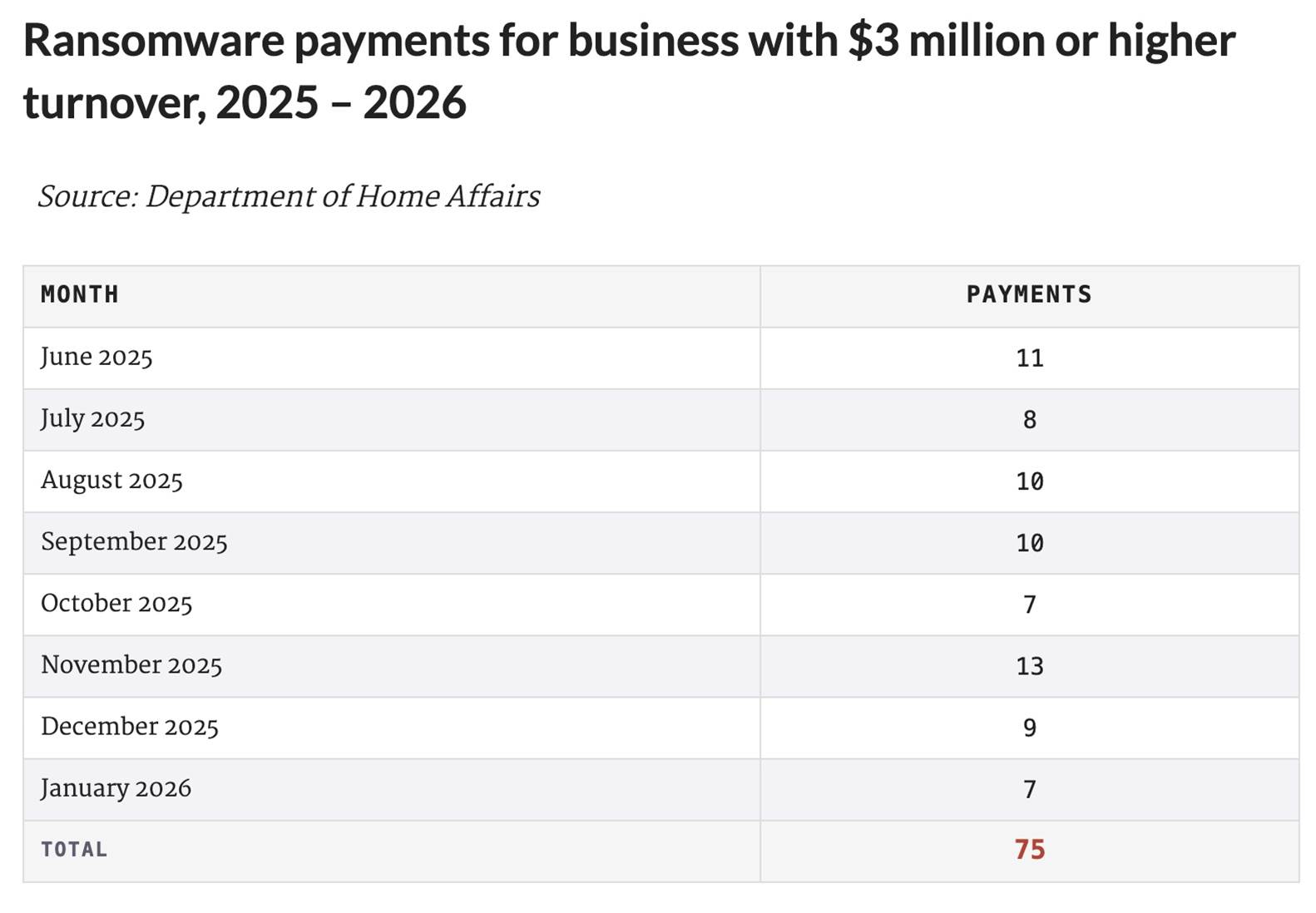 In addition to this, a Home Affairs spokesperson said that entities responsible for critical infrastructure - a cohort that also faces mandatory disclosure - made 19 ransomware payment reports in the the eight months to January 2026.