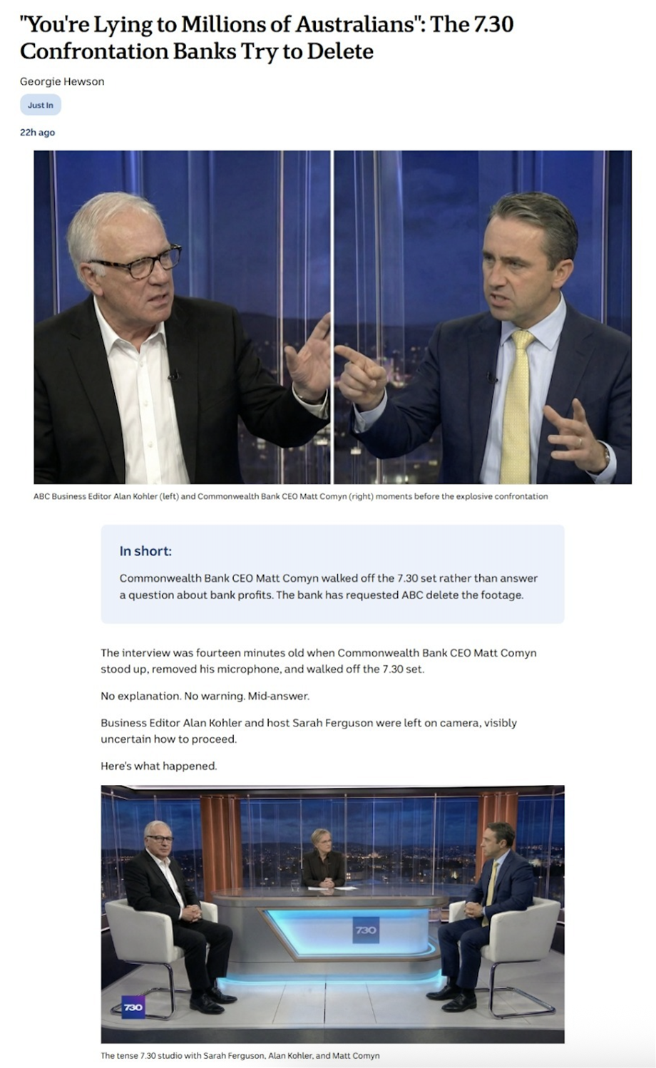 The Australian campaigns impersonate CBA and several journalists in a fabricated televised grilling.