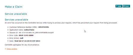 Over the last few days Centrelink FTB claimants have been unable to complete the online form without being removed from the system, receiving an error message around three-quarters of the way through during a question regarding Medicare.
