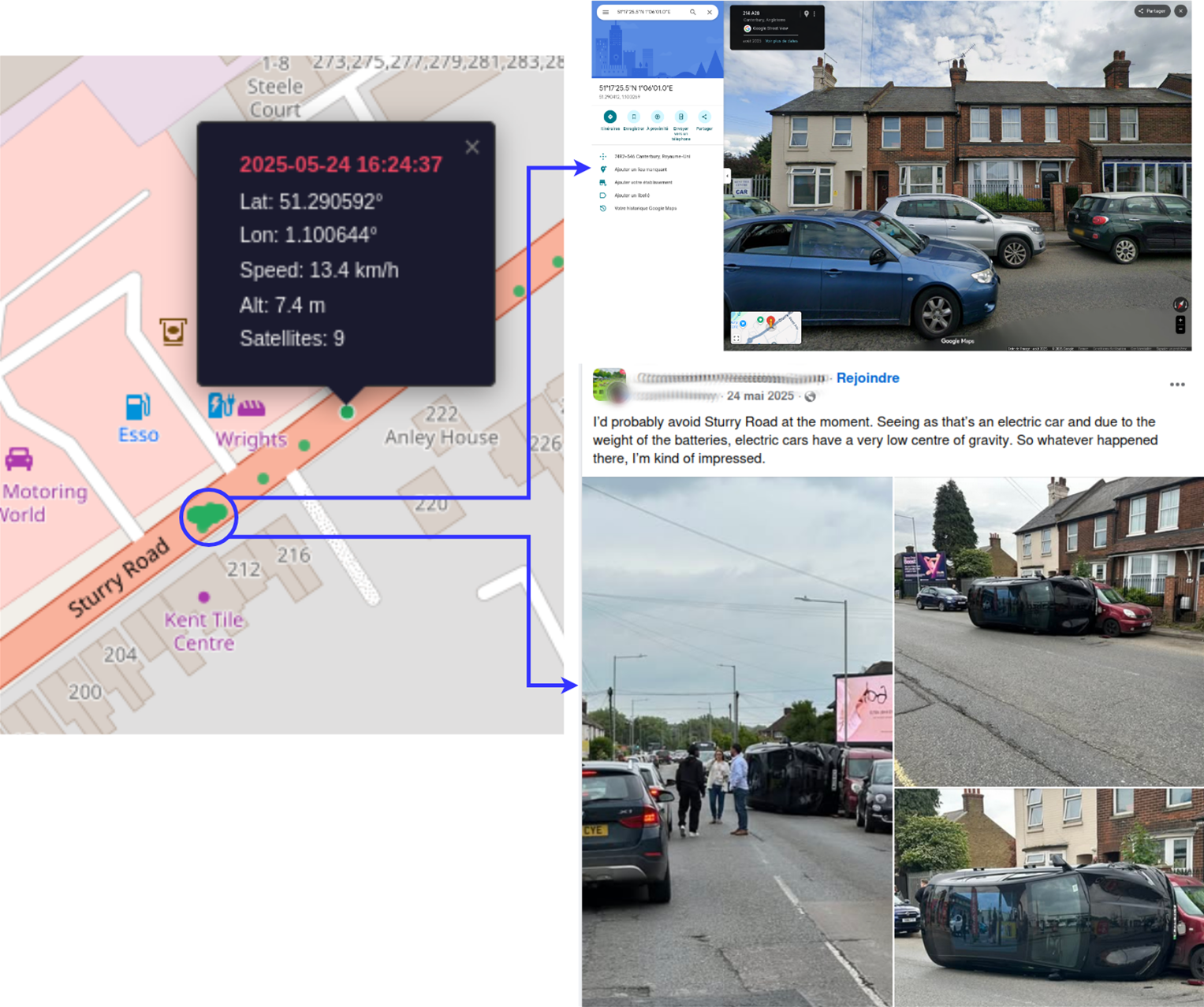 He was able to locate the address of the event, and correlate it to a Facebook post that showed a car accident that matched the GNSS data perfectly, featuring photos of a flipped over BYD Seal vehicle.