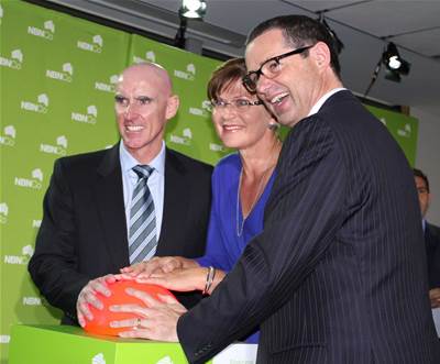 (From Left: NBN Co CEO Mike Quigley, ACT Senator Kate Lundy and Communications Minister Stephen Conroy switch on the NBN in Gungahlin in Canberra. Photo courtesy: Kate Lundy)